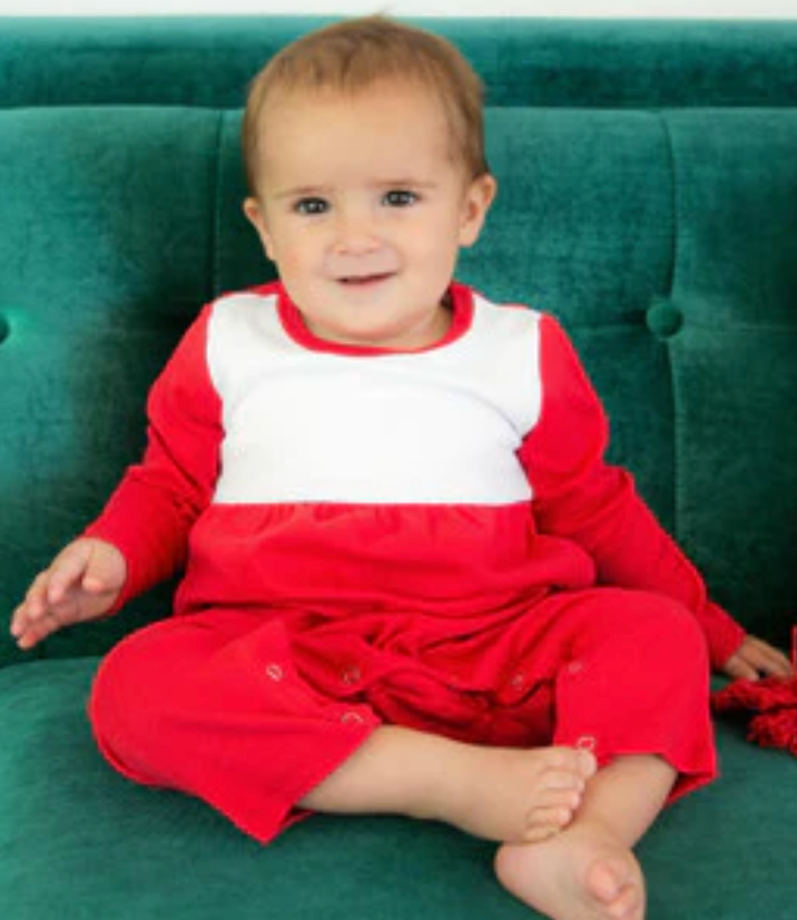 This romper is designed for everyday wear, featuring a soft knit fabric that is perfect for embroidery. It is both long-sleeved and long-pant, with snaps at the shoulder and along the crotch/legs for easy changes.